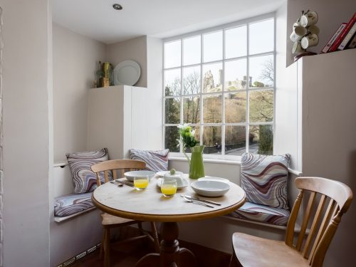 There are 3 windows, 2 large windows, two with views over the Castle, and the other with views over the garden. There are full length curtains for the front door, back door and windows in the lounge area, the dining area window has original wooden shutters. There is a large 3-seater sofa and a 2-seater sofa and an armchair. Both with extra cushions (feather – can be removed on request) and there is an oak nest of tables. There is a pine dining table that can seat 8. There is a painted dresser in the dining area.